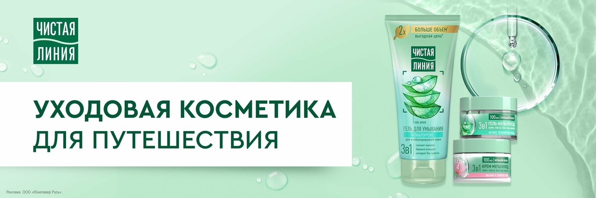 В линейке «Чистая Линия» есть нежный гель для умывания 3 в 1 — он мягко очищает кожу и придает ей матовость без ощущения стянутости и сухости. Объем продукта достаточно большой (200мл.), поэтому в поездку можно взять не всю тубу, а перефасовать часть в небольшой флакон.